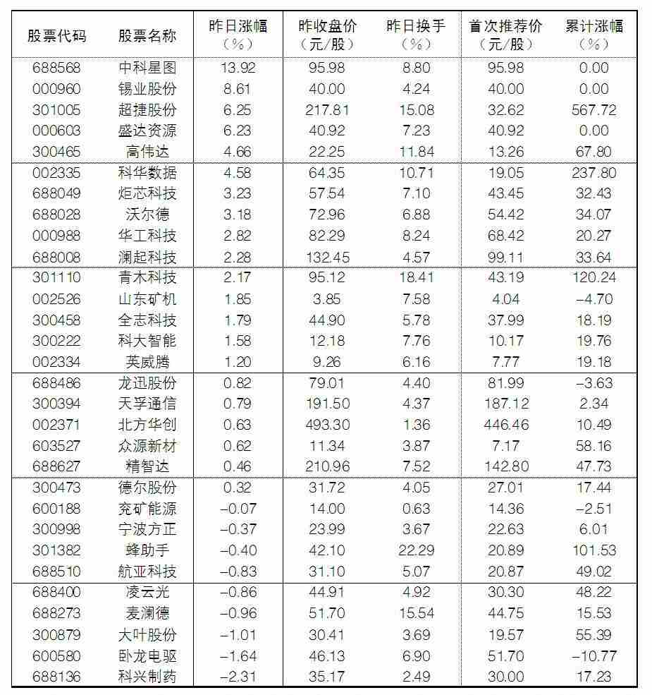 大众30指数成份股中,14日涨幅前五位的分别是超捷股份、高伟达、科华数据、炬芯科技、沃尔德,涨幅分别为6.25%、4.66%、4.58%、3.23%和3.18%;跌幅榜上,中国卫通、三花智控、中国人保、科兴制药等跌幅居前。
